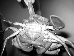 记者跟这位摊主买了两只重量共1斤1两的螃蟹,回家解开螃蟹的塑料绳子,用电子称一称:一只螃蟹重量为半斤,塑料绳子的重量为半两;另一只螃蟹重量为7两,塑料绳子的重量为半两。以记者购买时的每斤70元计算,记者光买绑螃蟹的塑料绳就花了7元钱。按照省工商局规定,捆绑螃蟹的混杂物不得超过蟹体重量的5%,即重量为1斤的螃蟹,捆绑它的混杂物重量不得超过半两,这位摊主显然已经违反了规定。