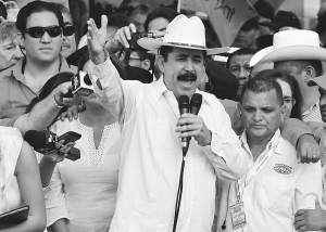 5月28日,洪都拉斯前总统曼努埃尔·塞拉亚(中)在洪都拉斯首都特古西加尔巴发表讲话。 遭政变罢免的洪都拉斯前总统曼努埃尔·塞拉亚28日经由邻国尼加拉瓜返回祖国洪都拉斯,结束了海外流亡生活。 新华社/法新