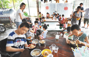 | 5月26日,三亚脑残疾儿童中心的孩子们在用午餐。 本报记者 苏建强 摄 |