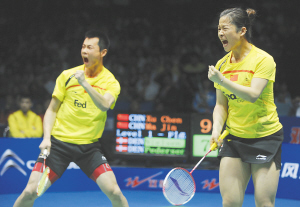 5月29日,在山东省青岛市举行的2011年苏迪曼杯世界羽毛球混合团体锦标赛决赛中,中国队3:0胜丹麦队。图为中国选手徐晨/马晋(右)庆祝得分。 新华社发