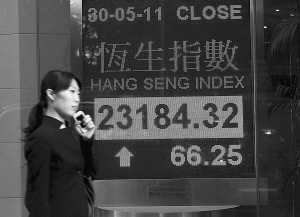 5月30日,一名市民从香港一家银行的恒生指数电子显示屏前走过。 当日,香港恒生指数上升66.25点,收报23184.32点。 新华社记者 吕小炜 摄