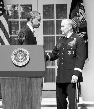 5月30日,在美国首都华盛顿白宫玫瑰园,美国总统奥巴马(左)提名陆军参谋长邓普西为下一任美军参谋长联席会议主席。 新华社发