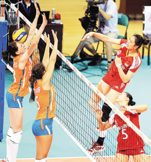 | 中国女排队员杨珺菁(右上)在比赛中扣球。