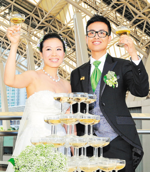 5月30日,中国香港台球选手傅家俊与未婚妻陈建萤共谐连理,并在香港沙田马场举行结婚典礼,与一众亲朋好友分享他们缔结良缘的喜悦。图为傅家俊(右)与新娘向嘉宾祝酒。 新华社发