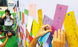| ←中国摄影家协会副秘书长、著名摄影家解海龙与小朋友们共同完成了一张观展留言条。 |