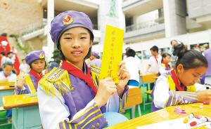 | ↓海口市新埠小学五年级二班的刘惠贤同学展示自己的观展留言条。 |