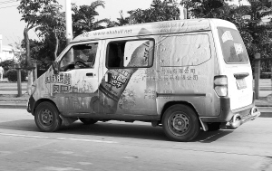 在海口市新华南电器城附近,记者看到一辆车身喷有某品牌电器广告的面包车,车体几乎全部被贴满,该公司地址和电话一目了然。当记者问车主车身广告是否到工商局申请时,车主称:“申请什么?我自己的车给自己做广告不行吗?有些人还租用别人的车身来做广告,也都没人管”。