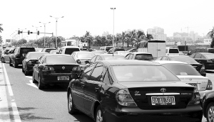 海南日报记者碰巧被堵在车龙中,在等候几分钟不见指示灯变换时,意识到可能是指示灯坏了,立刻下车采访,同时也参与电话报警行列。“我不但拨打了110,还给交警值班室打电话了,这么久还是没人来啊。”一位司机抱怨道。在现场堵车的20多分钟时间里,记者始终未见有交警到现场疏导交通。