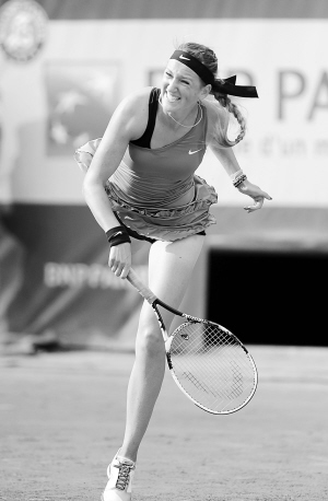 北京时间5月31日,白俄罗斯选手阿扎伦卡在法网公开赛中以2:0击败俄罗斯选手马卡洛娃,晋级八强。李娜在八强战中的对手正是阿扎伦卡。图为阿扎伦卡在比赛中回球。 新华社发