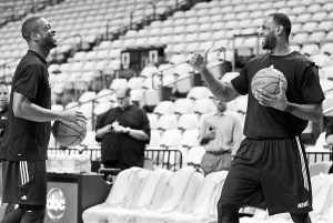 5月30日,热火队球员韦德(左)和队友詹姆斯在训练中说笑。当日,迈阿密热火队在迈阿密进行训练,备战次日与达拉斯小牛队的2010-2011赛季NBA总决赛首场比赛。 新华社/路透