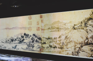 | 这是6月1日拍摄的通过多媒体技术“合璧”后的《富春山居图》“剩山图”(右部)与“无用师卷”(左部)。这件书画珍品360年后首次“合璧”展出成为两岸关注热点。 新华社发 |