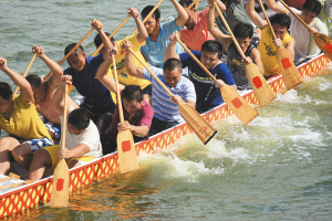 | ←今年端午节,三亚榆港社区和南海社区的渔民,将自筹资金在三亚港区举办第五届“渔家乐”杯龙舟比赛。图为6月3日渔民们在三亚河上练龙舟。