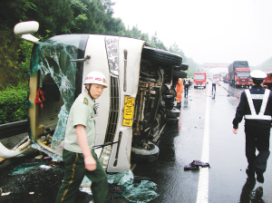 这是6月4日在京港澳高速岳阳段拍摄的客车侧翻现场。