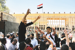 6月4日,巴勒斯坦旅客在拉法口岸抗议口岸大门关闭。 一些巴勒斯坦人4日冲击拉法口岸埃及一侧大门,要求埃方开放拉法口岸。巴勒斯坦伊斯兰抵抗运动(哈马斯)官员说,埃及当天早晨在未通知巴方情况下,突然关闭拉法口岸。 新华社发