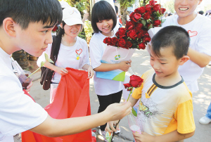 6月5日,是第三十九个“世界环境日”。当天上午,50多名环保志愿者在海口明珠广场、万绿园等地,用鲜玫瑰、花种子等来换取过往市民手中的塑料瓶,以此方式号召市民珍惜资源,注重环保。该活动由团省委、省青年志愿者协会等主办。 本报记者 苏晓杰 摄