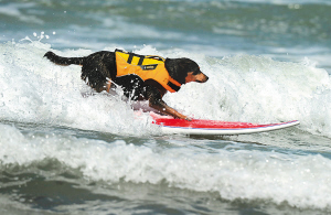 6月4日,一只小狗在美国加利福尼亚州圣迭戈附近的帝王海滩参加冲浪比赛。 当日,美国加利福尼亚州的帝王海滩举行了第六届洛斯·科罗纳多湾胜地小狗冲浪比赛。 新华社/法新