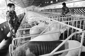| 近期全国肉猪均价、猪肉均价屡创新高。6月3日,全国出栏肉猪均价17.7元/公斤,同比上涨88.7%。猪肉价26.95元/公斤,同比涨80.27%。图为海南保亭黎族苗族自治县红兄村养猪基地。 特约记者 黄青文 摄 |