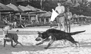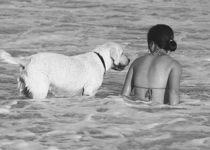 6月7日,三亚大东海边景区明媚的阳光、蔚蓝的海水吸引来自国内外的游客,但是有些市民带着爱犬到景区遛狗、游泳,让带着孩子的游客提心吊胆。不少游客说,在公共场所遛狗,要考虑到其他人的感受。 本报记者 李英挺 摄