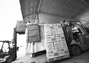 6日上午,在海口南北水果市场,一车刚从山东烟台运来的苹果正在卸货。端午节期间, 该市场每天的出货量都在1000吨以上。 本报记者古月 通讯员尹辉 摄