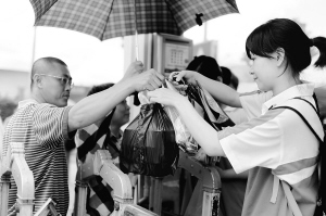 | ↑ 6月7日,在海口市一中高中部考点,考完第一科目后,家长将从家里带来的饭菜递给考生。
