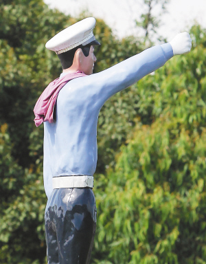 →仿真警察手持的慢行警示牌不知去向,且被乱搭上一件衣服。