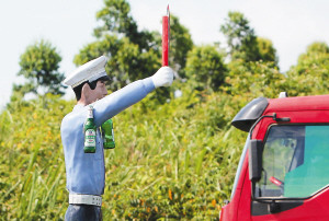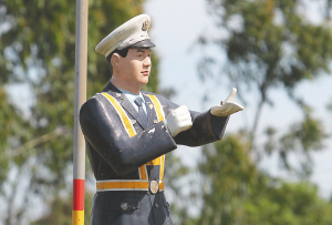 6月4日,记者发现,在海南G98高速路海口绕城高速, 海口市交巡警支队安装的仿真警察遭到不同程度破坏和恶搞,令仿真警察的警示效果大为减弱。 据悉,海口市交巡警支队继去年在事故隐患多的粤海大道、绕城高速公路等路面安装仿真交警后,今年又新安装了一批仿真警察,目的是增强路面警示效果,预防重大交通事故的发生,正确引导过往车辆文明安全行驶。 本报记者 李英挺 摄影报道