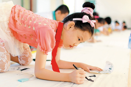 6月10日,在海口市琼山四小校园内,孩子们正在百米长卷上用心绘画。当天,琼山区禁毒委联合团区委及各小学师生举行的“依法禁毒共建和谐社会 百米画卷齐绘美好家园”青少年现场绘画活动,拉开了该区禁毒宣传月的序幕。 本报记者 张杰 摄