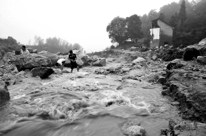 | 6月10日,湖南岳阳临湘市詹桥镇观山村村民在山洪冲积的石堆间穿行。