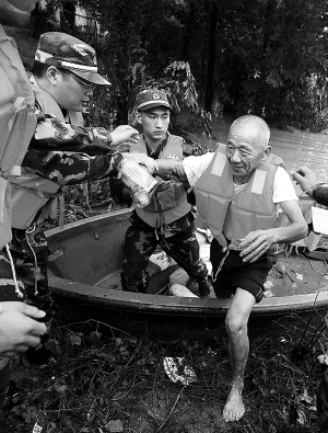 | 6月10日,武警战士在湖北省崇阳县沙坪镇组织群众转移。 新华社发 |