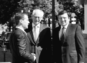 6月10日,欧盟委员会主席巴罗佐(右)、欧洲理事会常任主席范龙佩(中)和俄罗斯总统梅德韦杰夫在俄罗斯历史名城下诺夫哥罗德出席第27届俄罗斯-欧盟峰会(俄欧峰会)。 新华社记者 刘力航 摄