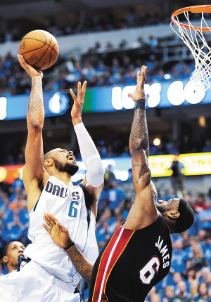 10日,小牛队在总决赛第五场比赛中,主场112:103战胜了热火队。小牛队以总比分3:2领先。图为小牛队钱德勒(左)在比赛中上篮。 新华社发