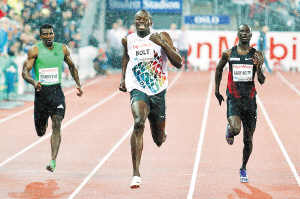 10日,博尔特(中)在国际田联钻石联赛奥斯陆站男子200米比赛中,以19秒86的成绩获得冠军。 新华社发
