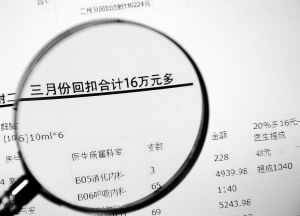 这张回扣清单显示,三月份两大医院医生提成少则几十元,多则上千元,数额最高的尹某回扣高达25744元,两大医院三月份总计提成27万多元。清单上同时显示,“醒脑静针”的规格为10ml,每支医院零售价76元,其中回扣16元,计算出的回扣比达21%。