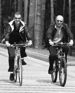 6月11日,俄罗斯总统梅德韦杰夫(左)和总理普京在莫斯科郊外的总统府进行非正式会谈期间骑车。 新华社/路透