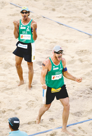 6月11日,在2011年国际排联世界沙滩排球巡回赛北京大满贯赛男子决赛中,巴西组合艾利森/伊曼纽尔以2:1战胜德国组合布林克/莱克曼,获得冠军。图为艾利森(右)/伊曼纽尔在夺冠后庆祝。 新华社发