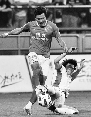 12日,在中超联赛中,天津队主场以0:1负于广州队。图为天津队李玮锋(右)与广州队郜林拼抢。 新华社发