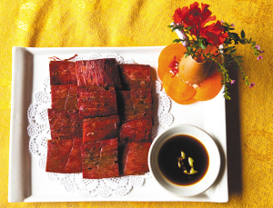 除了牛腩煲外,手撕牛肉也让人钟情不已。四四方方小块的薄片牛肉,被炸至红中带褐,外酥里嫩,醮着配有芥末的酱油,用手按竖纹一条一条地撕食,回味无穷。利中酒家的厨师说,这是取自牛后腿的肉,用调料腌制过后,放入高压锅中煮上一段时间,再用滚油炸至金黄。这时还不能算成菜,还要再用大火爆炒过后才能上碟。