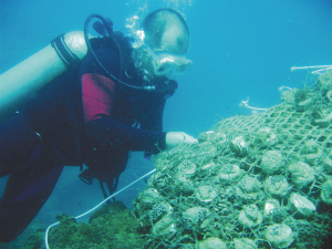 | 潜水员对放归海底的珊瑚进行固定。 陈宏 摄 |