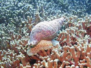 这是几枚在海南很常见的宝螺,卵圆形光滑外体散发着柔和温润的光泽,浅褐色的珐琅质壳面上,密布着深深浅浅的斑点和花纹。“你看这种颜色较深的,叫黑星宝螺,海南很多。这种淡黄色的,背面有两道灰色的横纹,可是真正的‘宝贝’,历史上曾拿来当货币使用的就是它了,金线宝螺。现在,工艺品店都拿它们串起来做成饰品或者工艺品了。”