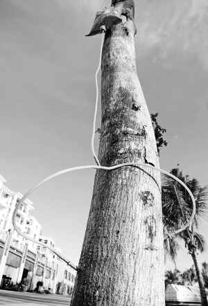 人病了要打点滴治疗,树病了怎么办?也一样要打点滴治疗。6月12日,三亚市三亚湾路旁“身体欠佳”的大叶榄仁树挂着输液袋,药液正在通过针管进入树体。给树打点滴是一种新型养护技术,不仅减少喷药对环境的污染,而且见效快。 本报记者 李英挺 摄