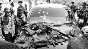 图为索马里政府军士兵站在穆罕默德被击毙时所驾驶的车辆旁。 新华社发