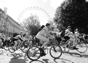 6月11日,参加裸体骑行活动的人们经过伦敦市中心的摩天轮伦敦眼。当天,伦敦举行一年一度的裸体骑行活动,上千名参与者骑车穿过伦敦市中心,呼吁人们保护环境和自行车的交通权利。 新华社记者 曾毅 摄