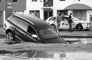 | 6月13日,在新西兰南岛城市克赖斯特彻奇,一辆汽车在地震后陷入路面深坑里。