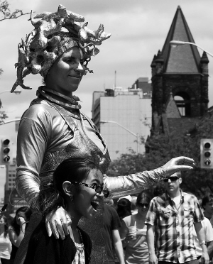 6月12日,一名女孩在加拿大多伦多布洛尔大街“街头节”上与表演者合影。当日,加拿大多伦多第十五届布洛尔大街“街头节”在市区布洛尔大街一段街道上举行。 新华社发(邹峥摄)
