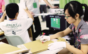 6月13日,在位于海口的高考评卷场,我省高考评卷工作人员在将考生答卷原样扫描并储存到计算机里,进行编号登记,为评卷教师在网上评卷打分作好准备。 本报记者 张杰 摄