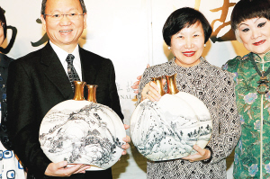 法蓝瓷《富春山居》 对瓶上市 6月15日,台北故宫博物院院长周功鑫(右二)、法蓝瓷有限公司总裁陈立恒(左)在台北故宫博物院举行的《富春山居》对瓶新品发布会上展示以黄公望的《富春山居图》为蓝本制作的瓷器。该对瓶全球限量制作发售288套。 新华社发
