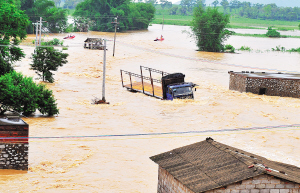 6月16日,广西来宾市兴宾区凤凰镇桥等村遭遇水灾,大货车被淹在洪水中。 当日,广西来宾市遭遇强降雨袭击,造成该市兴宾区、忻城县多个乡镇大面积受灾,一些村庄被淹。来宾市兴宾区凤凰镇桥等村80户350多人被洪水围困,由于缺少皮划艇和冲锋舟,救援人员一度无法接近被困群众。这一情况发生后,当地党委、政府立即寻求各方支持,调集冲锋舟和皮划艇,将物资运送到受灾群众手中,同时组织群众转移到安全地带。 新华社记者 李斌 摄