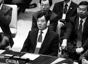 | 6月15日,在美国纽约联合国总部,中国外交部副部长翟隽(前)出席安理会利比亚问题会议。 新华社发 |