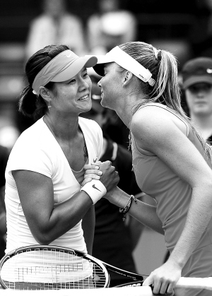 | 李娜(左)赛后与汉图楚娃握手。 新华社发 |