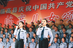 六月十六日晚八时许,临高县委大院人民会堂成为歌的海洋。为庆祝中国共产党成立九十周年,临高举行“临高儿女颂党恩”红歌歌咏大赛。这是来自政法系统的合唱队在深情演唱。 文\本报记者 王勇 图\本报记者 张杰